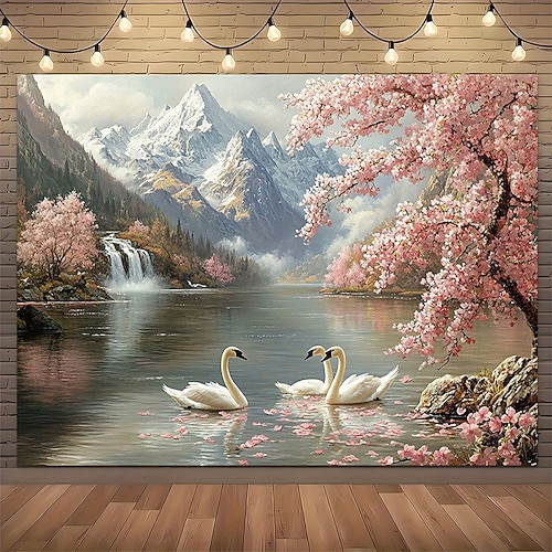 Lago del Cigno Bianco, paesaggio naturale, montagna innevata, fiori di ciliegio, fiori rosa, cascata, scenario sereno, arazzo da parete, grande sfondo per camera da letto, soggiorno, decorazione per