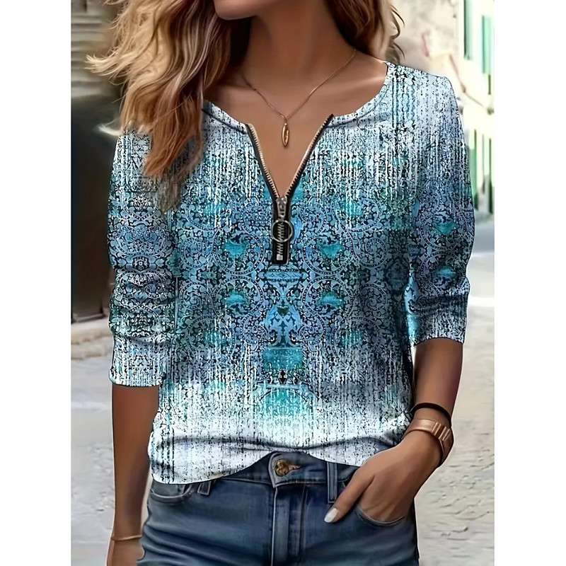 Damen T-Shirt mit Viertel-Reißverschluss langärmlig lässig grafisch tribal vintage Bohemia tropisch hawaiianisch V-Ausschnitt reguläre Tops Alltag Ausgehen Schwarz Frühling Herbst