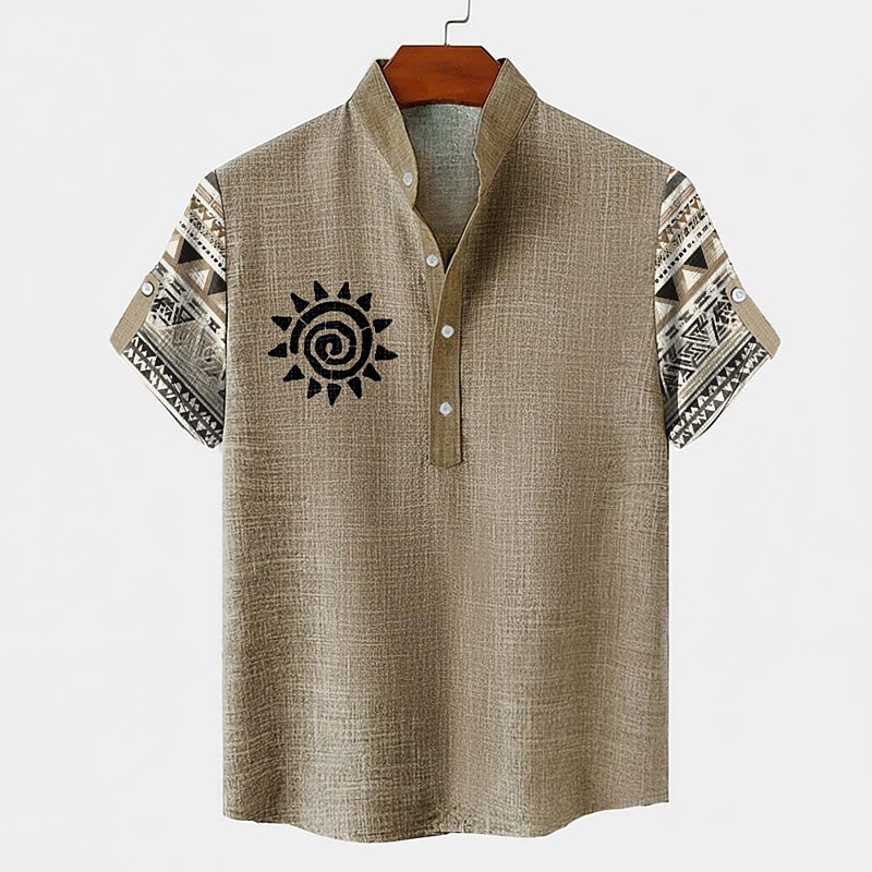Men's Tribal Ethnic Sun Totem Shirt Button Down Shirt Short Sleeve Vintage Retro Holiday Casual Daily Summer Spring Standing Collar Henley Collar 3D Print Linen Like Shirt Dark Khaki Green Khaki