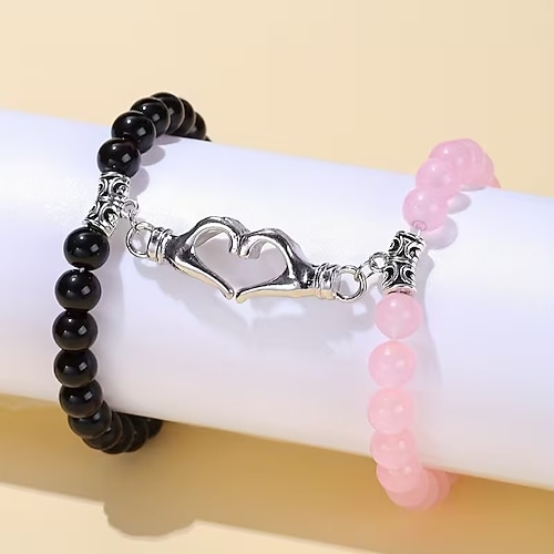 Set di 2 braccialetti neri e bianchi con perline per San Valentino braccialetti a cuore magnetici in pietra naturale gioielli di amicizia fatti a mano set regalo di accessori leggeri unisex abbinati