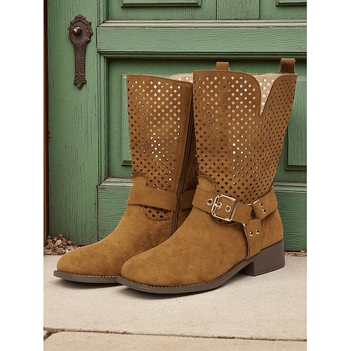 stivali da equitazione alti fino al ginocchio color cuoio da donna – finta pelle scamosciata con dettaglio fibbia, tacco basso e suola robusta per la moda autunnale e invernale