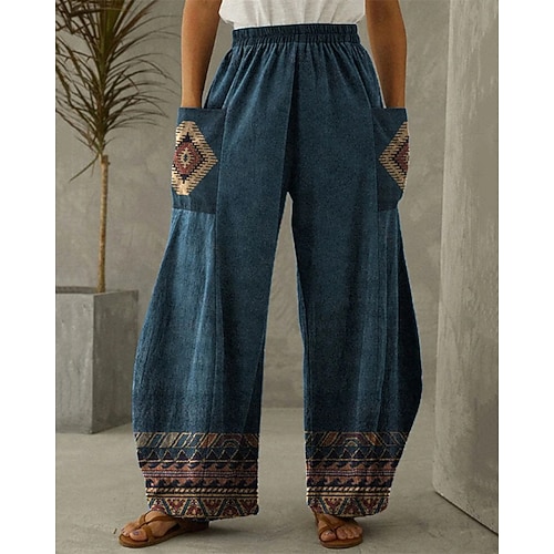 Per donna Gamba larga Pantaloni Vacanza Stile Etnico Boho Lunghezza intera Vita Alta Grafico Tasca Fascia Elastica Stampato Comodo Traspirabilità Inelastico Vacanza Streetwear Casuale Blu scuro