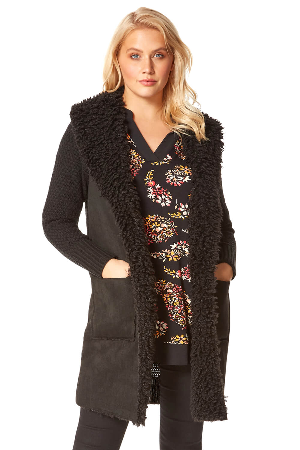 Roman Womens Longline Faux Shearling Knit Coatigan - Black - Size 12 UK | Roman Sale | Discount Designer Brands