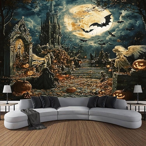 arazzo con sfondo di Halloween, arazzo da parete con castello fantasma notturno, zucca e strega, grande murale decorativo per camera da letto, soggiorno, feste e decorazioni per la casa