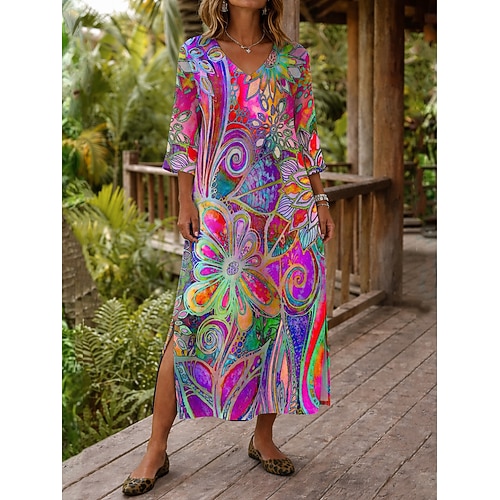 Per donna Abito maxi Abito Boho Abito a Tubino Vestito Estivo Abito da Spiaggia Bohemien Vacanza Etnico Spiaggia Ferie Data Vestibilità regolare Grafico Astratto Manica 3/4 Scollo a V Fucsia Estate
