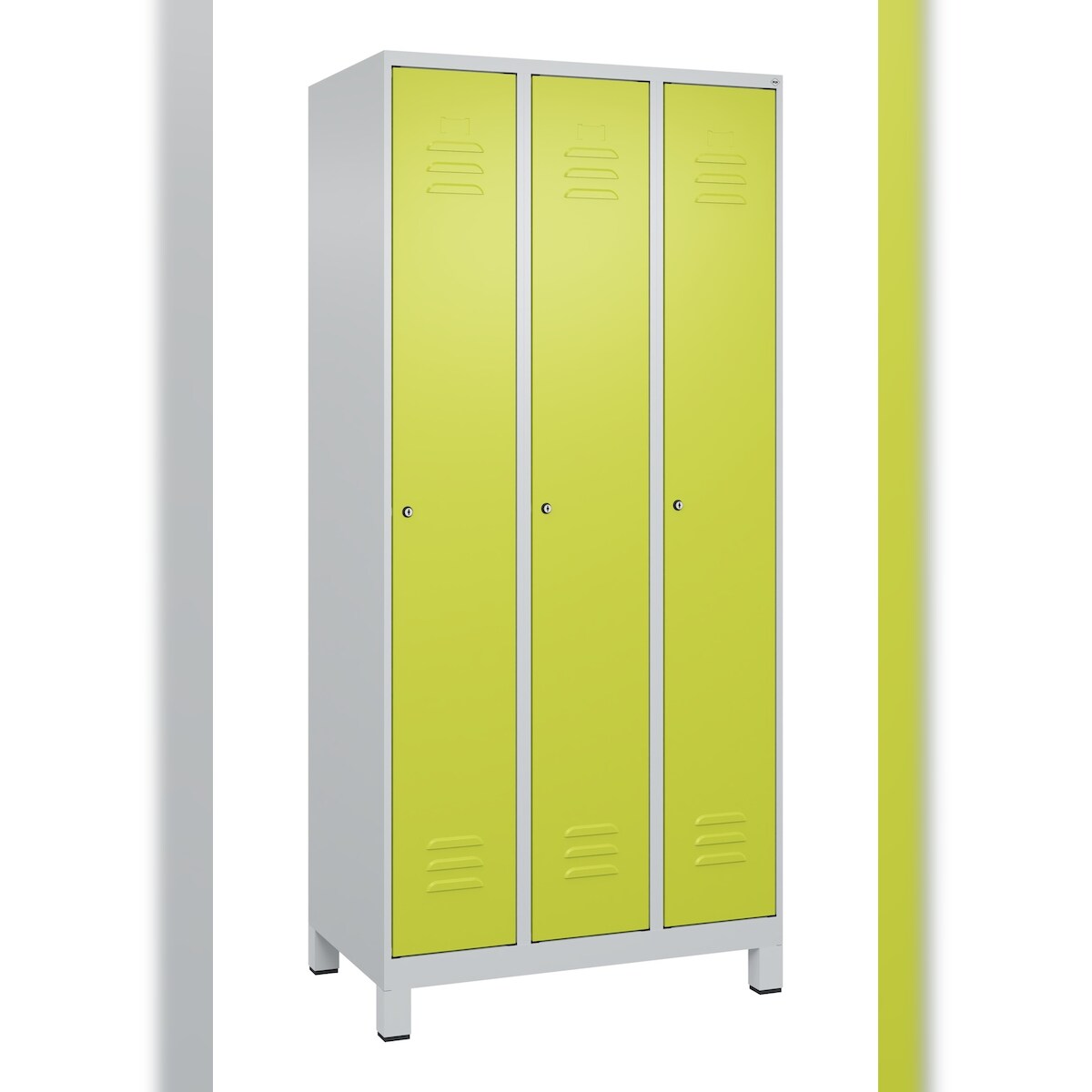 C+P Spind Classic PLUS, Füßen, 3 Abteile, HxBxT 195x90x50cm, Zylinderschloss, Hellgrau/Clowngrün von PROREGAL