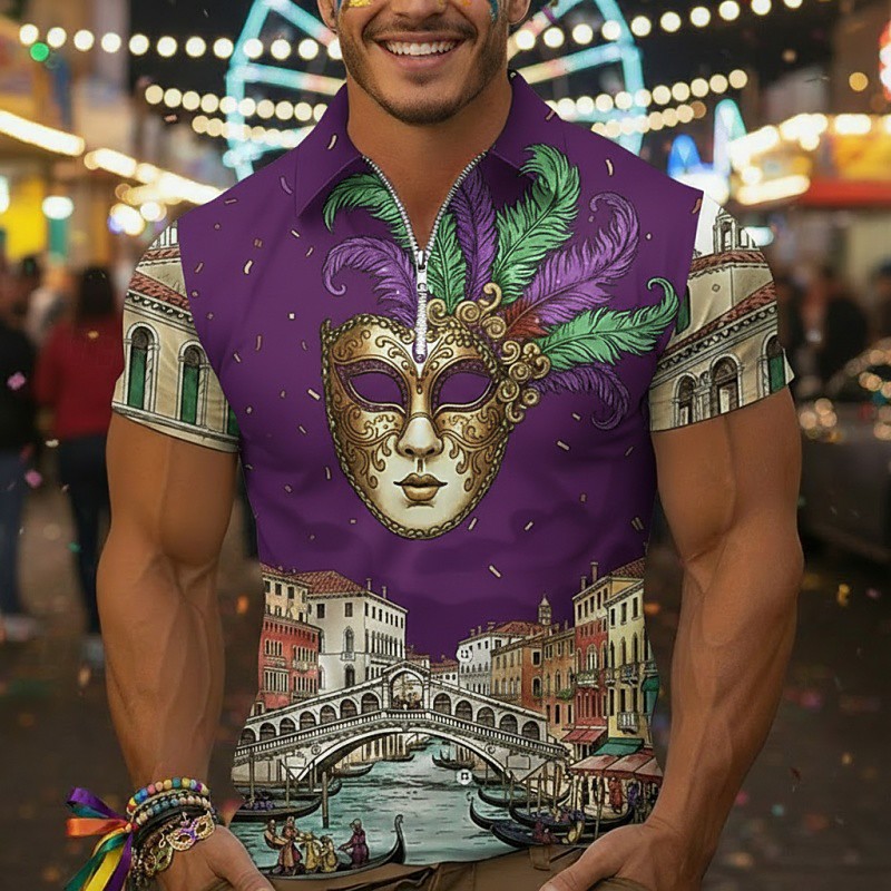 Men's Polo Polo Shirts Daily Carnival Quarter Zip Short Sleeve Fashion Basic Graphic Mask 3D Print Summer Spring Regular Fit Yellow Red Purple Polo