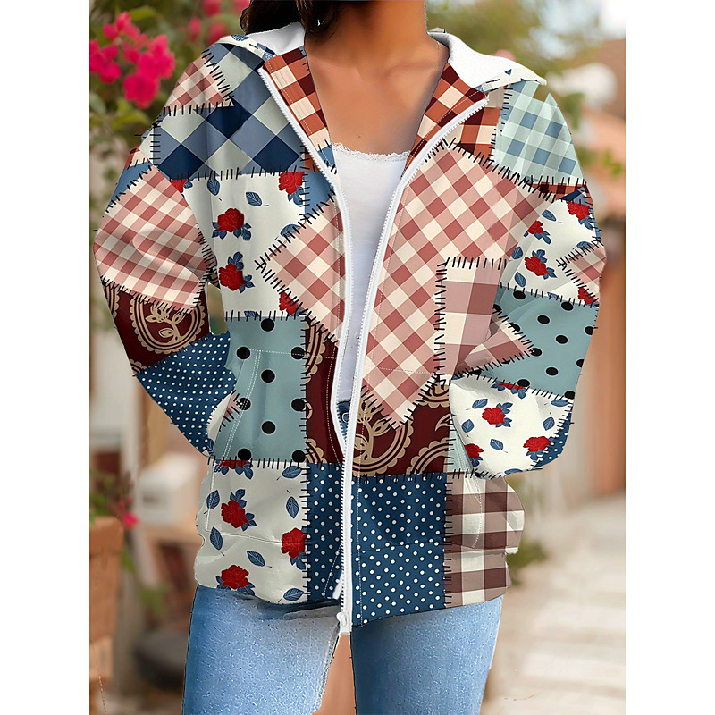 Women's 3D Print Vintage Boho Hoodie Patchwork Hoodie Sweatshirt Floral Zip Up Vintage Casual Long Sleeve Hooded Street Dailywear Patchwork Zipper Pocket Red Blue Orange Light Blue Spring Fall