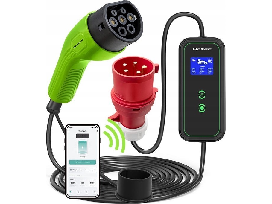 Qoltec mobilus įkroviklis elektromobiliui EV su reguliavimu 2 in 1, Type 2 | 11 kW | Wi-Fi | LCD | 3 fazės | 5 m