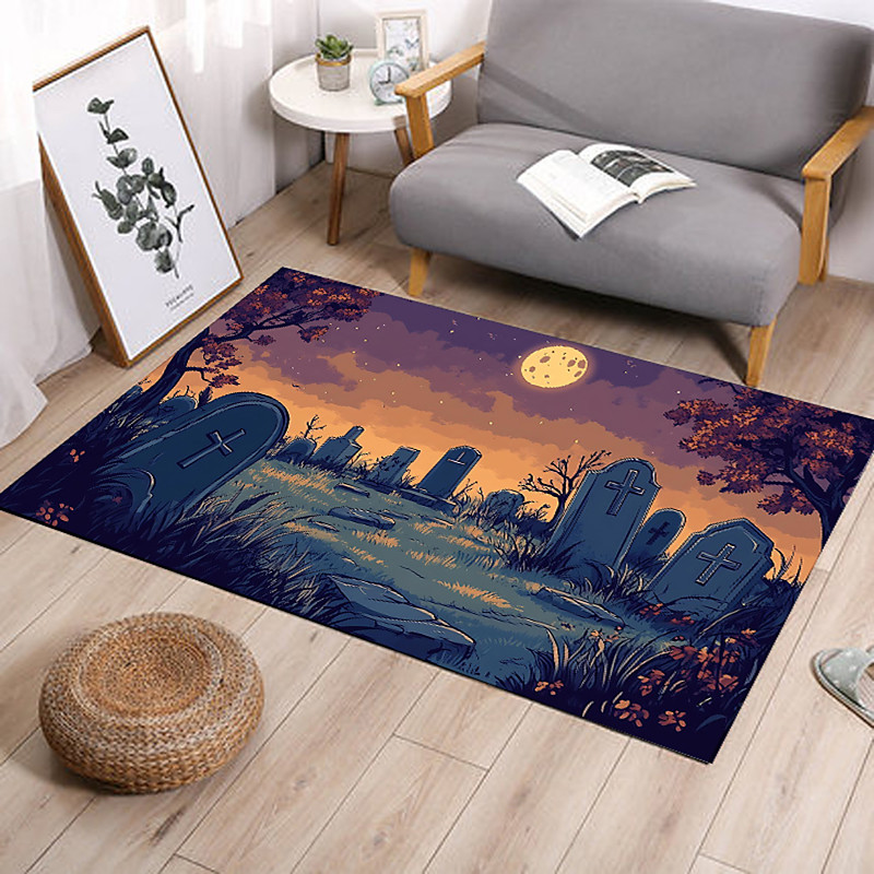 Halloween Pumpkin Lantern and Bat Pattern Flannel Floor Mat, Non-Slip Home Entrance, Bathroom, Bedroom Decorative Rug