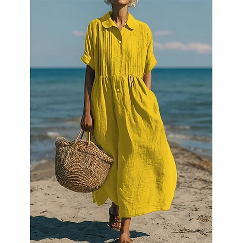 Per donna Abito Lungo Maxi Abito Finto cotone e lino Abito Camicia Vestito a caftano Vestito Casual Elegante Casual Quotidiano Vacanza Data Vestibilità regolare Semplice Manica Corta Bavero Giallo