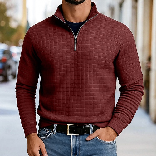 Per uomo Geometrico Plaid Nido d'ape Felpa Moda Quotidiano Classico Casual Collo alla coreana Zip a un quarto All'aperto Casa Ufficio Lavoro Blu Marrone Verde Grigio Con zip Autunno Inverno