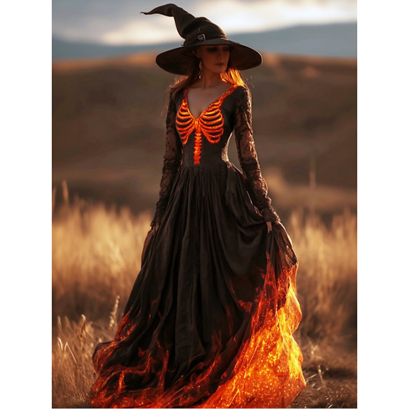 Women's Skeleton Maxi Dress Pleated Dress Boho Date Going out Regular Fit Skull Long Sleeve V Neck Black Orange Light Orange Fall
