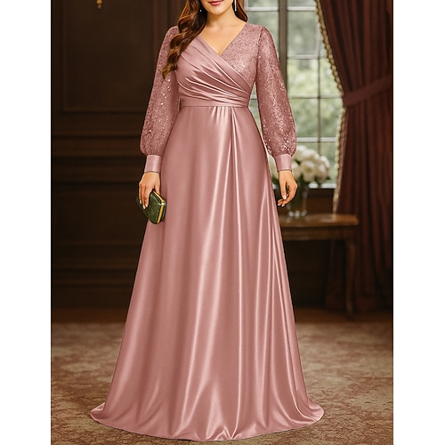 Abito da ospite per matrimoni in stile A-Line fino al pavimento Abiti formali Abito a campana Abito per la madre della sposa maniche lunghe scollo a V elegante vintage taglie forti con pieghe e