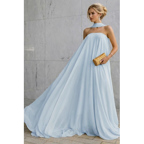 Matrimonio in spiaggia abito da sera A-Line abito da fata formale invitato matrimonio lunghezza fino al pavimento senza maniche senza spalline in chiffon elasticizzato con pieghe sciarpa