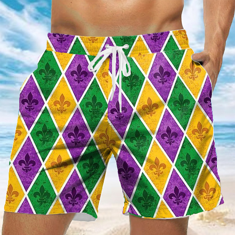Mardi Gras Men's Rhombus Carnival Mardi Gras Fleur De Lis Swim Trunks Swim Shorts Board Shorts Mid Waist Fashion Casual Party Holiday Side Pockets Mesh Lining Elastic Drawstring Waist Designer
