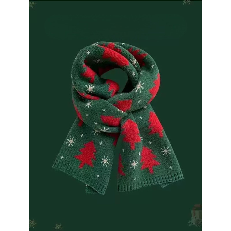 Women's Christmas Scarf with Reindeer and Tree Knit Pattern, Winter Holiday Gift, Cozy Green Accessory
