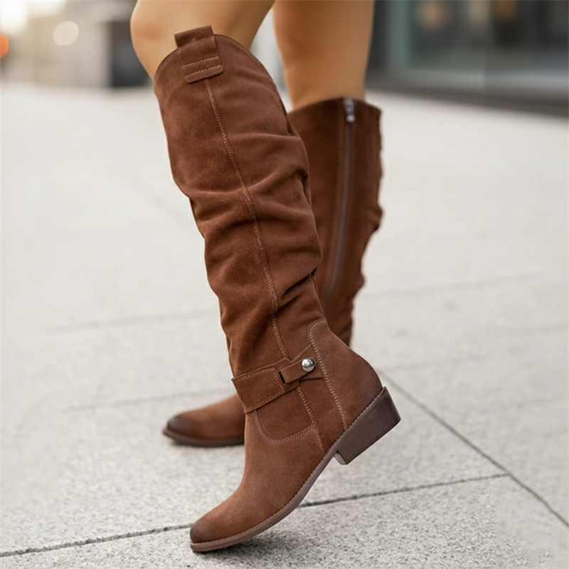 Women's Slouchy Suede Knee-High Boots with Buckle - Casual Flat Heel for Everyday Fall Fashion