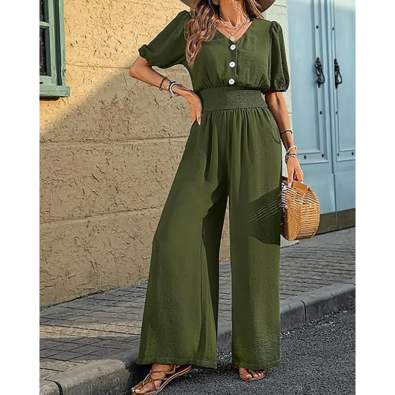 Women's Jumpsuit Elegant Solid Color Short Sleeve Wide Leg V Neck Pocket Buttons Vacation Daily Regular Fit Black Wine Army Green Summer