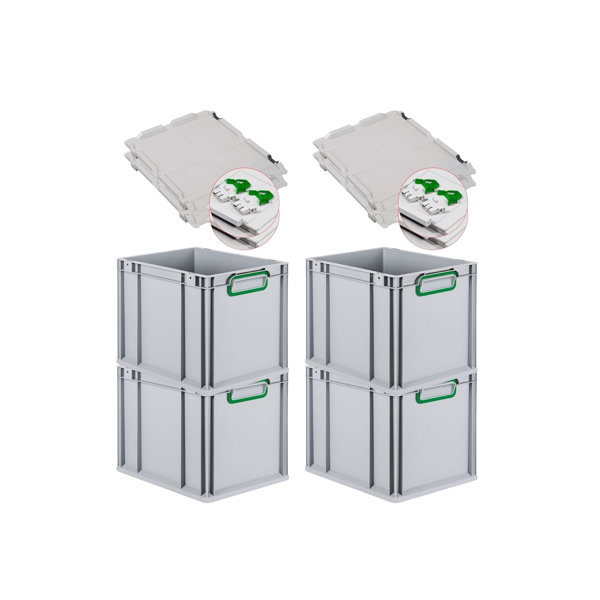 PROREGAL 4x Eurobox NextGen Color mit Scharnierdeckel & Verschlüssen | HxBxT 22x30x40cm | 30 Liter | Griffe grün geschlossen | Glatter Boden