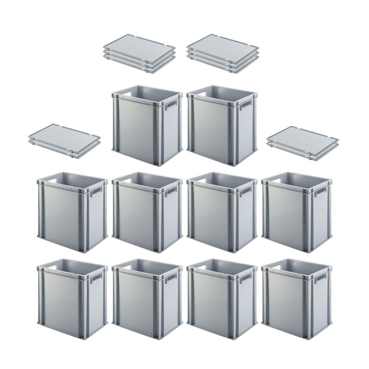 PROREGAL 10x Eurobehälter mit offenem Griff und Scharnierdeckel | HxBxT 40x30x40cm | 37 Liter | Grau | Eurobox