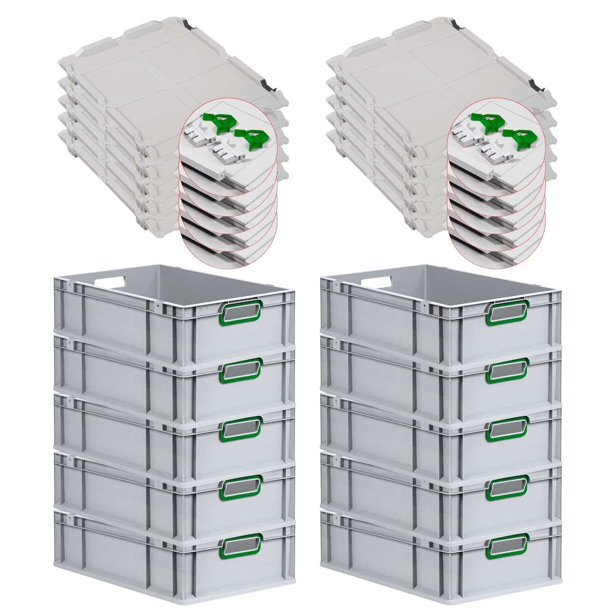 PROREGAL 10x Eurobox NextGen Color mit Scharnierdeckel & Verschlüssen | HxBxT 17x40x60cm | 34 Liter | Griffe grün offen | Glatter Boden