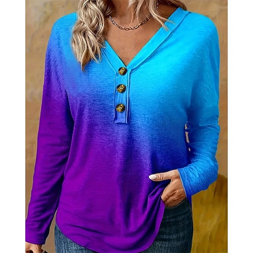Per donna Maglietta Top estivi Tinta unica Ombre Elegante Moda Classico Manica Lunga Scollo a V Top Regolari Quotidiano Uscire Weekend Patchwork Bottoni Viola Primavera Autunno