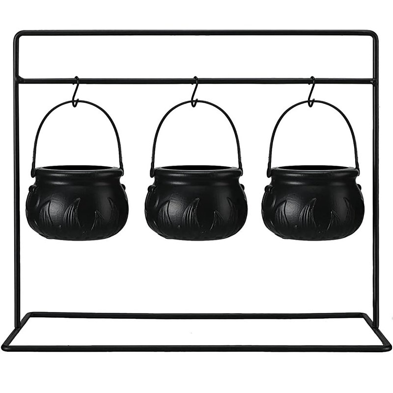 Halloween Decor - Set of 3 Witches Cauldron Serving Bowls on Rack - Black Plastic Cauldron for Indoor Outdoor Home Kitchen Decoration - (non-food contact)
