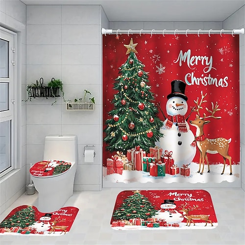 Set di 4 tende da doccia, tra cui sedile del water e tappetino da bagno – decorazione natalizia per interni del bagno, motivo a pupazzo di neve e albero di Natale, materiale in poliestere impermeabile