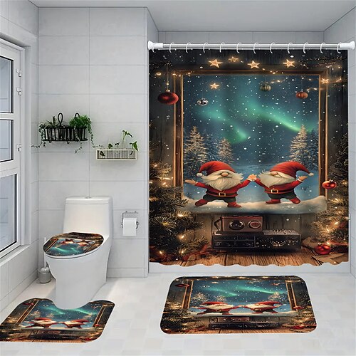 combinazione di tende da doccia in quattro pezzi, tra cui un sedile del water antiscivolo e un tappetino da bagno – motivo con camino natalizio, albero di Natale, pupazzo di neve, materiale in