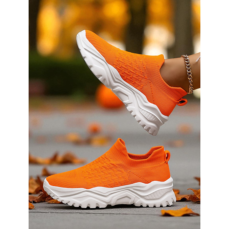 Women's Orange Slip-On Flyknit Sneakers – Breathable Mesh Lightweight Walking Shoes with Chunky Sole for Casual and Sport
