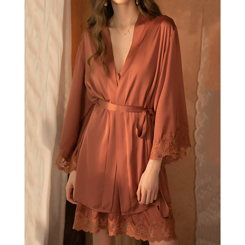 Women's Robe Nightgown Pajama Set Casual Soft Satin Pure Color Lace Dress Daily Home Bed Long Sleeve Straps Black White Pink Wine Brown Summer Regular Fit