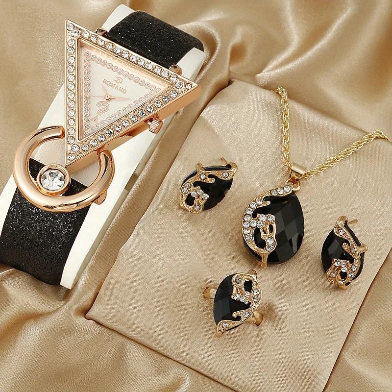 5pcs/set Women's Watch Luxury Triangle Pointer Quartz Watch Shiny Rhinestone Analog Wrist Watch Jewelry Set, Gift For Mom Her