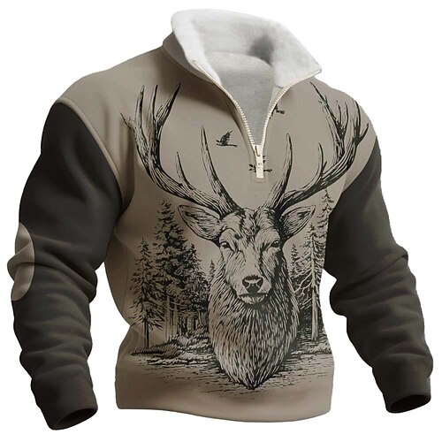 Herren Tiermotiv Hirsch Fleece Pullover Mode Lässig 3D Jagd Stehkragen Viertelreißverschluss Outdoor Streetwear Urlaub Geschenk Braun Khaki Dunkelgray Grau Halber Reißverschluss Herbst Winter Designer