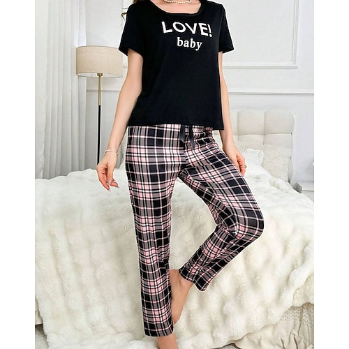 Per donna Abbigliamento da Casa Set Pigiama Moda Semplice Casual Griglia / Plaid Lettera Elastico in vita Pantalone Casa Vacanza Manica Corta Girocollo Nero Primavera Autunno Vestibilità regolare