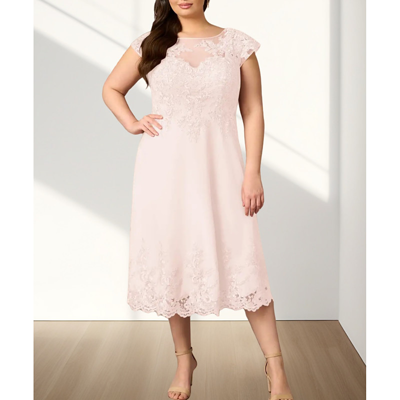 A-Line Tea Length Party Dress Cocktail Dress Wedding Guest Dress Mother of the Bride Dress Short Sleeve Crew Neck Elegant Wedding Guest Engagement Party Chiffon with Appliques