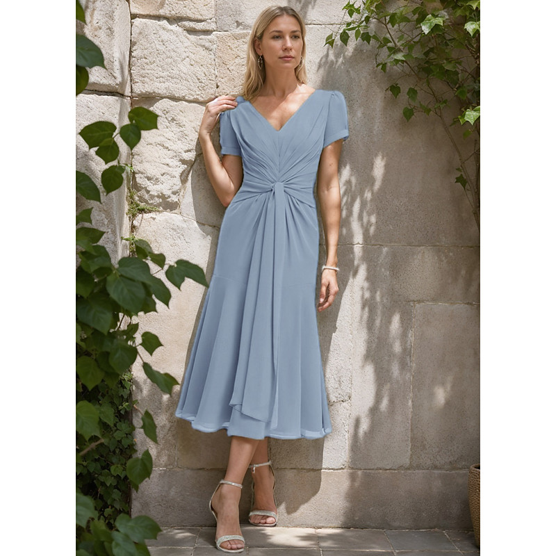 A-Line Mother of the Bride Dress Formal Wedding Guest Elegant Simple Minimalist V Neck Tea Length Chiffon Short Sleeve with Pleats Ruched