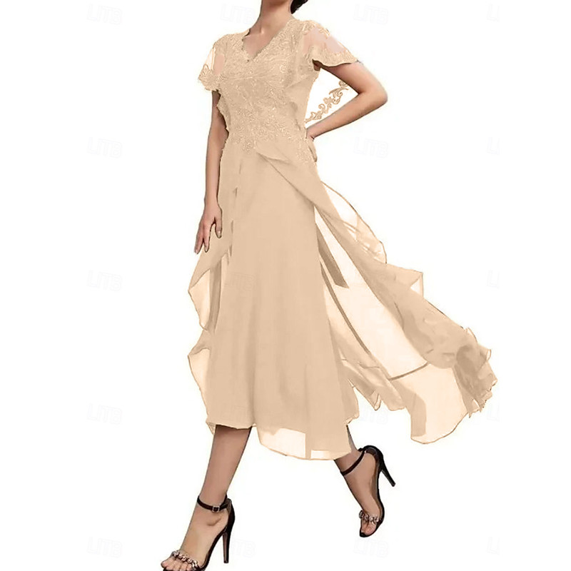 Two Piece A-Line Tea Length Wedding Guest Dress Mother of the Bride Dress Short Sleeve V Neck Elegant Simple Luxurious Formal Wedding Guest Chiffon Crepe with Lace Beading