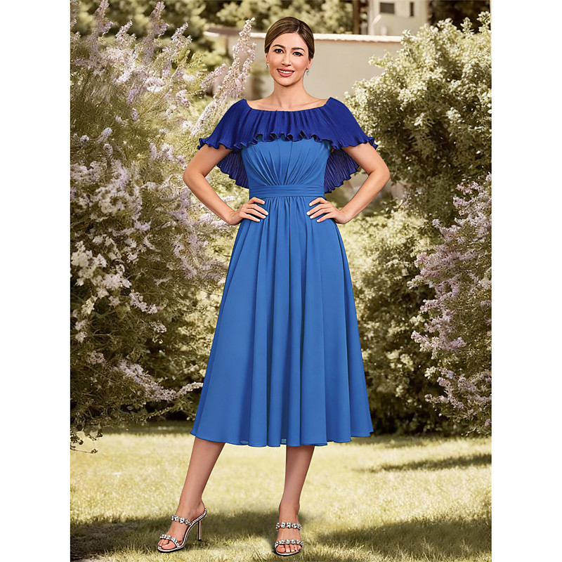 A-Line Mother of the Bride Dress Wedding Guest Elegant Plus Size Jewel Neck Tea Length Chiffon Short Sleeve with Ruffles free custom size
