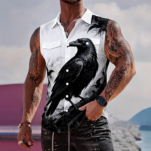 Herren Vogel Krähe Raven Hemd Knopfhemd Ärmelloses Shirt Ärmellos Dunkler Gothic-Stil Outdoor Lässig Sommer Frühling Umlegekragen 3D-Druck Zwei Fronttaschen Blau Weiß Khaki Grau