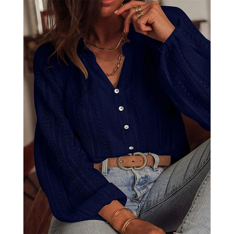 Women's Shirt Dressy Tops Plain Elegant Ladies Stylish Long Sleeve V Neck Regular Tops Work Daily Holiday Hollow Out Buttons White Pink Red Royal Blue Purple Spring Fall