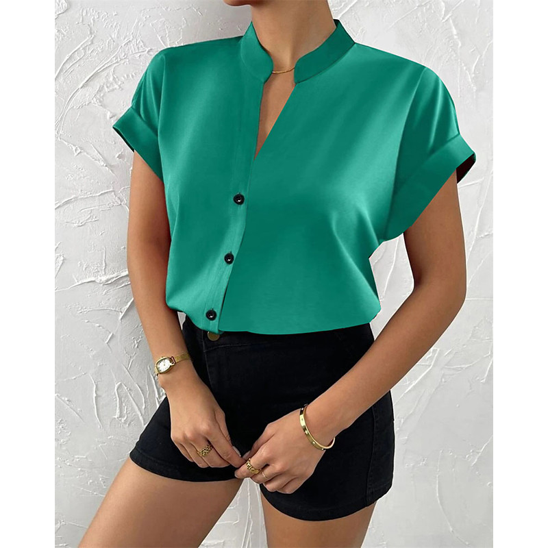 Women's Blouse Dressy Tops Solid Color Plain Elegant Vintage Daily Short Sleeve V Neck Regular Tops Daily Work Holiday Ruched Buttons Draped Blue Black Pink Orange Green Summer Spring