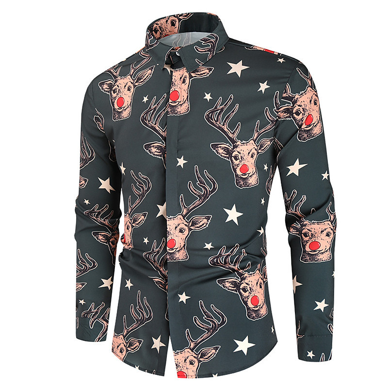 Christmas Men's Christmas animal Printed Shirts Shirts Santa Claus Elk Graphic Prints Turndown Black and Red Black / White Olive Green Green Black 3D Print Street Long Sleeve Button-Down Print