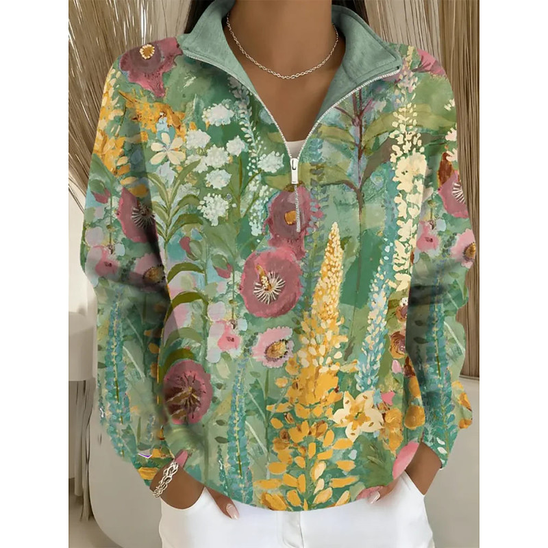 Women's Pullover Sweatshirt Floral Graphic Casual Long Sleeve Half Zip Regular Tops Casual Dailywear Holiday Zipper Pink Green Beige Spring Fall
