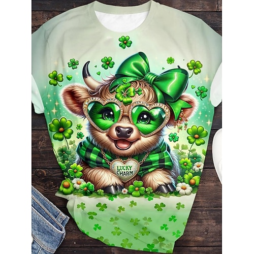 T-shirt da donna per il Giorno di San Patrizio floreale mucca stilosa classica casual maniche corte collo a giro top regolari stampa quotidiana bianco estate primavera