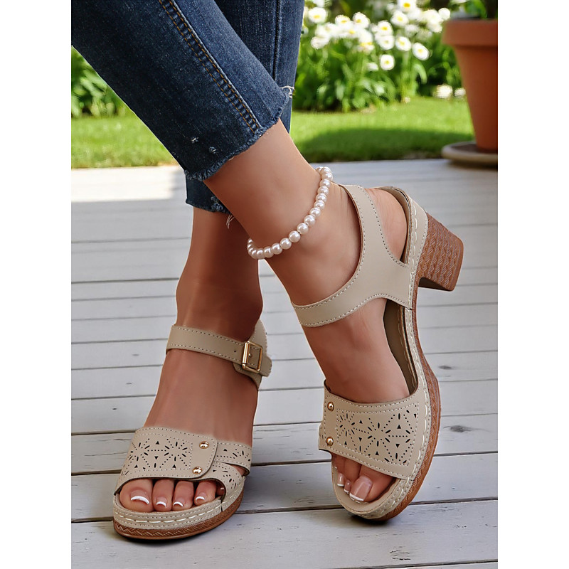 Women's Hollow-Out Buckled Heeled Sandals – Breathable Retro Summer Footwear for Garden Date, Workwear and Countryside Getaways