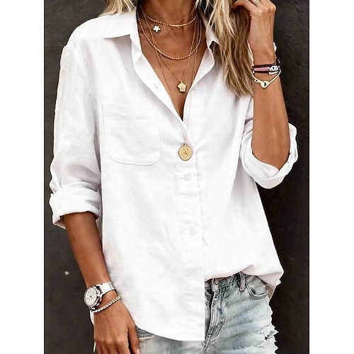 Per donna Camicie di cotone e lino Tinta unica Vintage Elegante Essenziale Manica Lunga Colletto a Camicia Top Regolari Quotidiano Tasca Bottoni Bianco Rosa Azzurro cielo Albicocca Estate Primavera