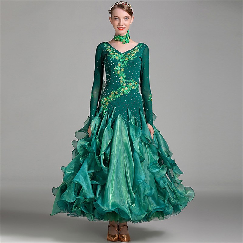 Latin Dance Dress Ruffles Splicing Women's Performance 3/4 Length Sleeve High Crystal Cotton Organza