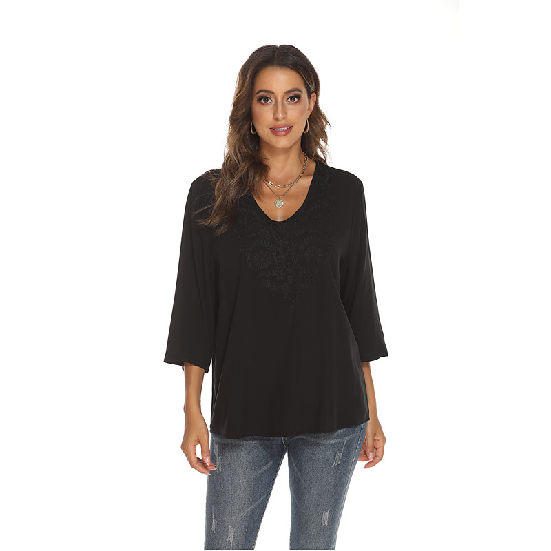Women's Boho Shirt Solid Color Floral Bohemia Daily Luxurious 3/4 Length Sleeve Elbow Sleeve Crew Neck Regular Tops Work Daily Going out Embroidered Black Yellow Rose Pink Summer