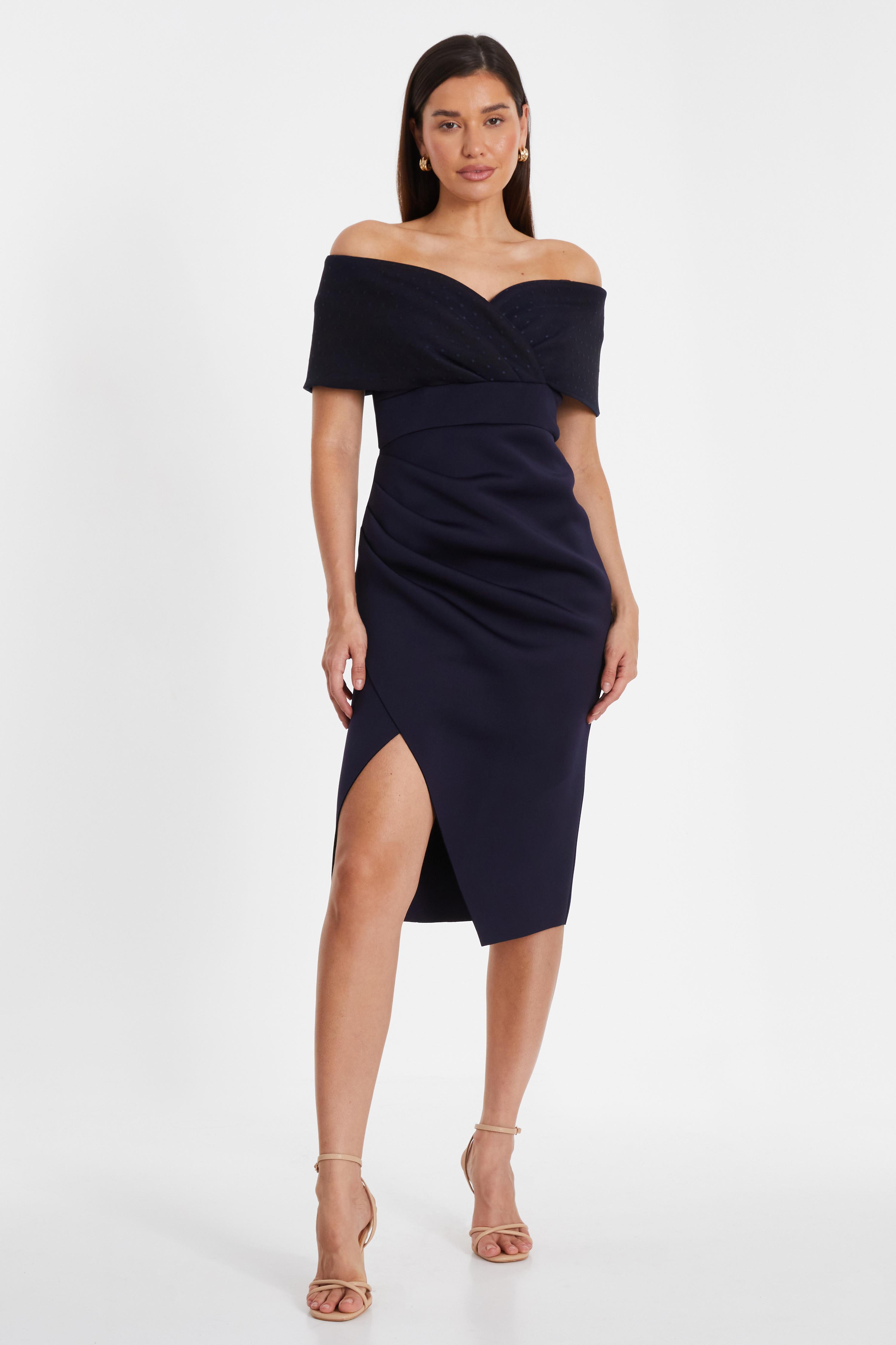 Quiz Womens Navy Bardot Ruched Midi Dress - Size 14 UK | Quiz Sale | Discount Designer Brands